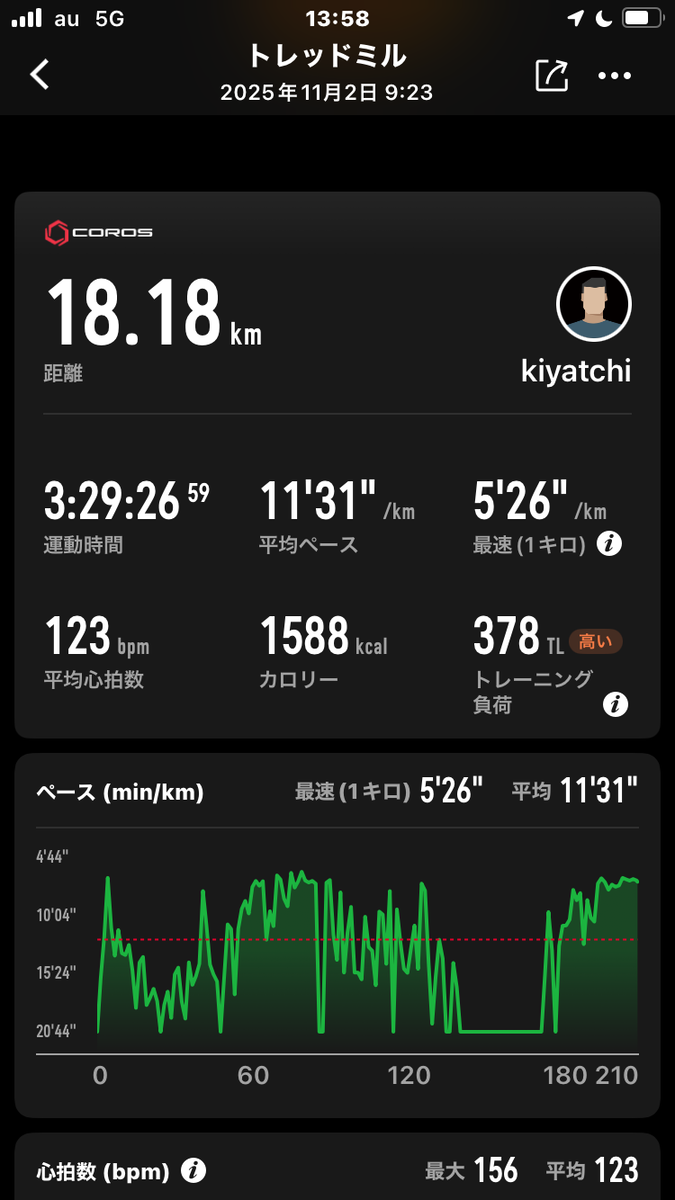 カロスの距離は18.18kmとなっていますが、1往復で 6.2㎞なので、2往復なので12.4㎞くらいです。18㎞ならば3往復の距離ですが、トレッドミルなので歩く振動などで距離を推測して出しているのだと思います。
