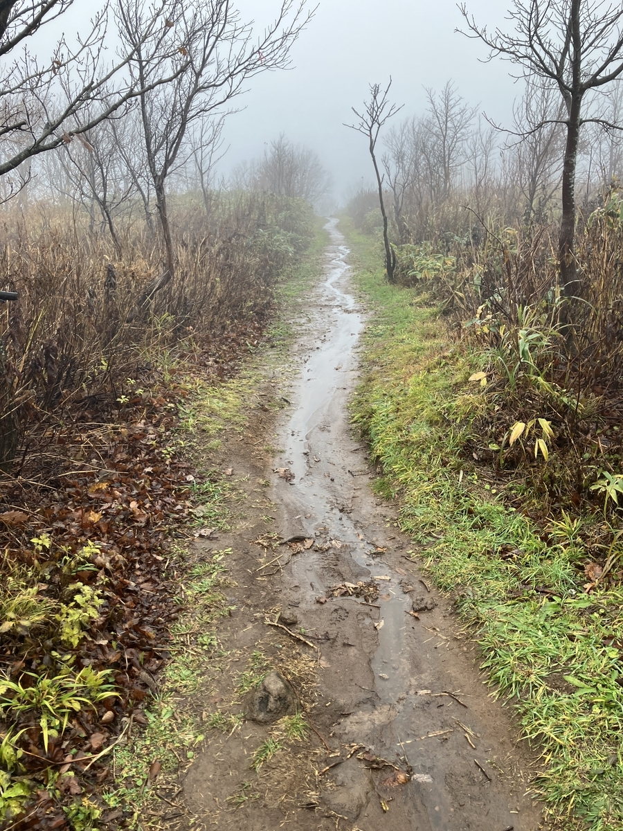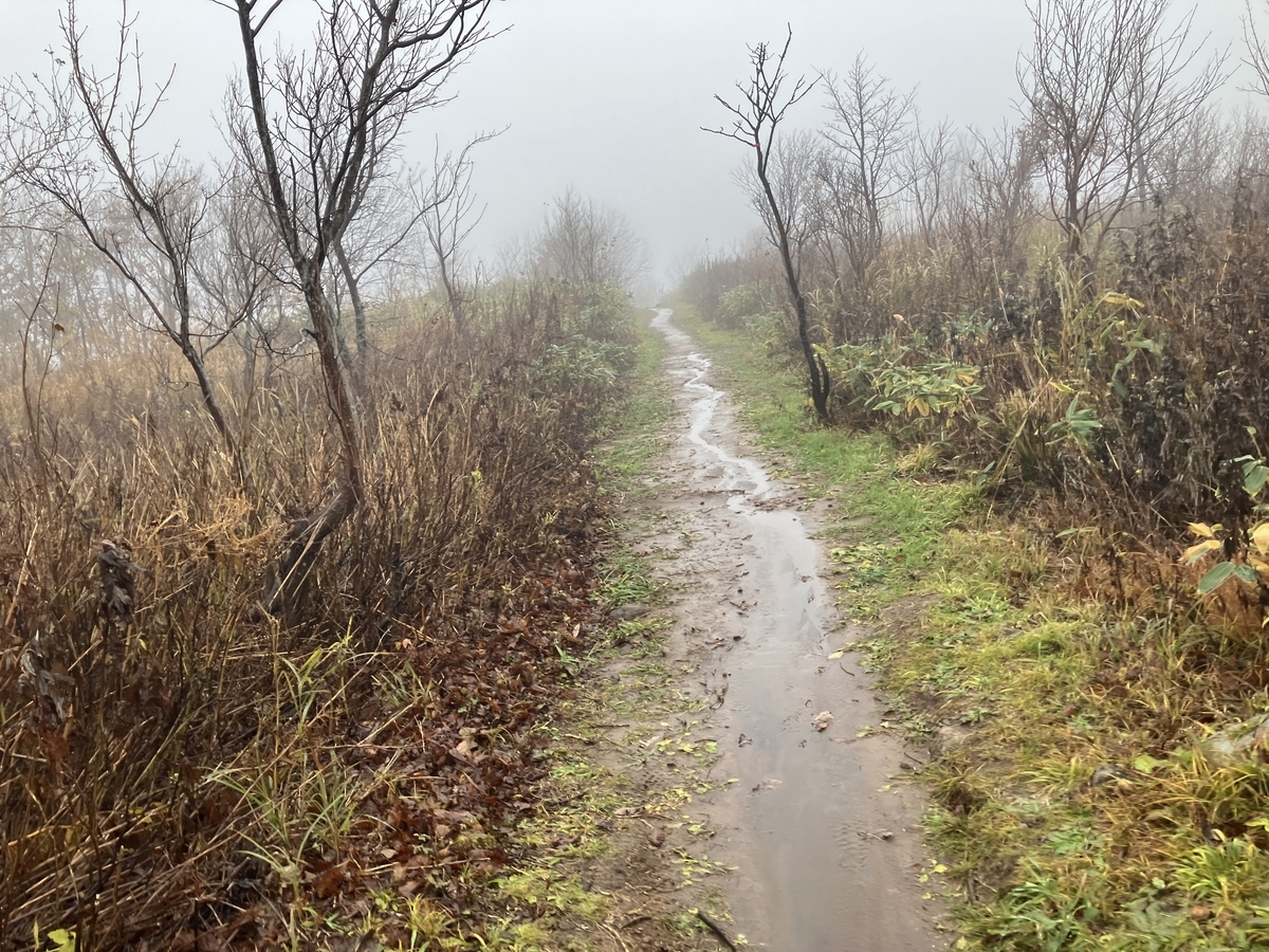 服装は上はオクタのロングにティトンのロング、下はナイキのスパッツ、シューズはアルトラのゴアにゴアのスパッツ。1本目は雨が降っていたので、レインウエアの上と、レインスカートを着ました。